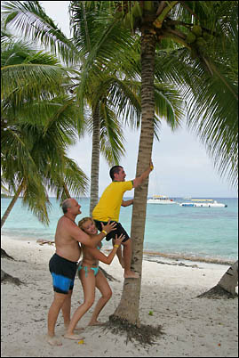 The highlight of the trip was going to Catalina Island. There lunch was included and we had 3 hours to relax, snorkel, etc. To be honest though, the island was hardly deserted as there were many tour groups, as well as merchants, not too mention the snorkeling was no better then here at our resort. Oh well, the Belski's (Sergei, his dad Viktor, and his sister Violetta) amused themselves by trying to emulate the locals by fetching themselves a coconut from a palm tree. Nice try guys, 'E' for effort! :) |