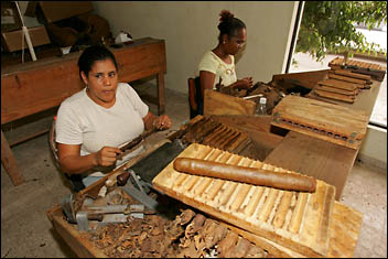 Next stop after the island was a stop at an esteemed cigar factory-- who knew it would be a small room with only 5 employees. It was actually quite neat though, and as you can see they made cigars of all sizes. One lady mixed a variety of leaves and filled the cigar preparing it for the press machine, while the second lady added the finishing touch after the pressing machine. According to our guide each employee must meet a minimum of 350 cigars per day to earn their wage--where any more would earn them a bonus. |