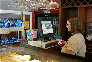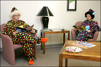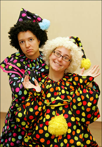 Tracy and Mandy at work, wearing Halloween clown costumes. |