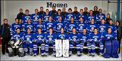 Its been a busy/stressful evening for me. I had to take a team photo of the hockey team and a portrait shot of two hockey players for the cover of a guide. I only had 15 min on the ice time dedicated for the team photo so I had to work fast, but the team was much bigger than I anticipated. We didn't have enough benches, so we had to move to the side of the rink and try to form 4 rows, using boards, instead of the usual 3 rows. In the process my light stand was dropped, light was smashed, umbrella was broken, and my hood on the strobe was bent. All and all, not my best team photo but with the time line and with all what was happening it will have to do.