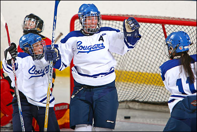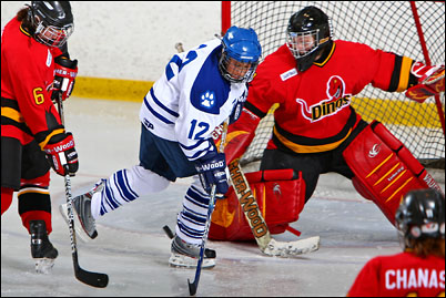 It was a very good game tonight. Mount Royal College Cougars girls team played against University of Calgary Dinos. In the beggining of the second period Cougars scored 3 goals in 5 minutes, and at the end defeted Dinos 3-1.