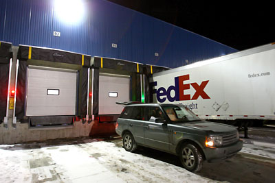 Tracy and I were late to one of the Christmas parties because I got a phone call asking me to come and pick up a delivery at a FedEx location. It was Tracy's present so I couldn't say no. We had to drive to a strange warehouse, almost outside of the city and go where the big trucks get loaded. This made me feel big in my small SUV so I snapped a shot of my car getting ready to be loaded :)