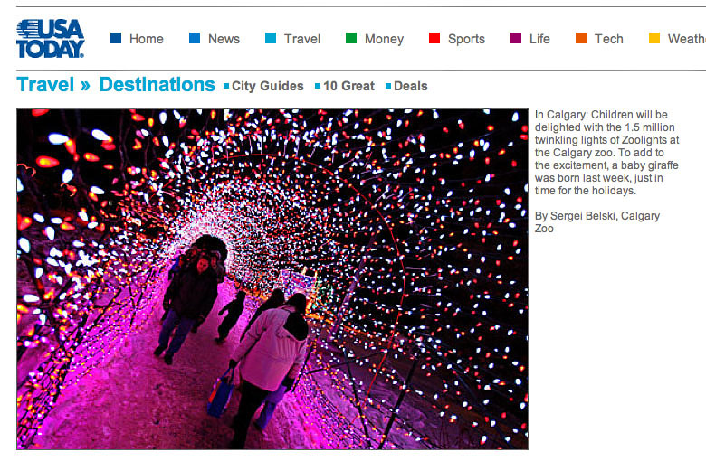 Last year I did a photo shoot of the Zoolights event for the Calgary Zoo and today one of the photographs that I took was featured on the USA Today website. I thought it was pretty cool that they write about Calgary :) You can see some more photographs from that photo shoot at Calgary Zoo on December 28, 2008 in my Blog Archive.