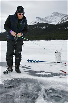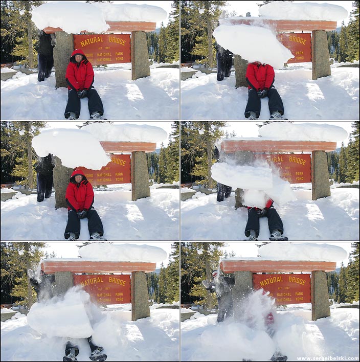 This weekend couple of my friends and I took a nice trip to Banff National Park for a day. The weather wasn't the best, but I think we all had a good time. It was interesting to stop and talk to a ice fisherman and it was kind of scary to walk on the ice with all the cracking that was going on. We had lunch at a great Greek restaurant in Banff (I really recommend it). Also you can see sequence of a joke we played on Greg while taking photo in front of the Natural Bridge sign. (Greg I hope you are ok)