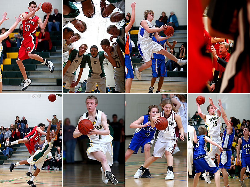 This Friday and Saturday Tracy and I were very busy doing a 2008 Bowness Trojans Classic basketball tournament. This is the second year we have done this tournament. It was not the most profitable tournament but I think I ended up with some great shots and I'm sure the kids will love them. The fans at the Bowness high school are great, they are really into the games and were probably the loudest fans I have seen so far. This got me more excited about the games and made me want to take better photos :) |