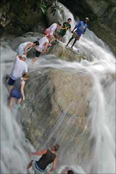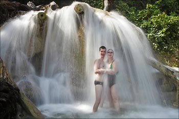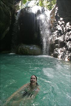 Port Antonio. This morning, 7:40 to be exact we left our hotel and headed to Port Antonio. We stopped to see Somerset waterfalls. The area was deep in the gungle, all covered by trees and it was very beautiful. We went for a very short boat ride that took us inside of the waterfalls where Tracy dove in for a little swim under the falling water.
