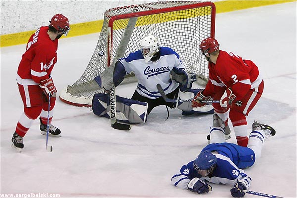 Yesterday I photographed ACAC men's hockey playoffs game between the Mount Royal College Cougars and the SAIT Trojans, where SAIT evened the best-of-five series at two games apiece with a 4-3 overtime victory.