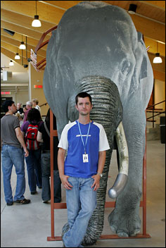 Photo of me (courtesy of Greg Plesche) standing at the Calgary Zoo in front of a life size elephant model made from some of my photographs. If you will visit the Zoo you will see many of my photographs but this must me the biggest.